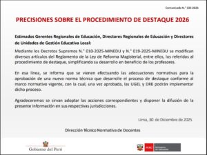 El MINEDU viene realizando las adecuaciones normativas para la aprobación de una nueva norma técnica que desarrolle el proceso de destaque conforme al marco normativo vigente.