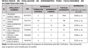 Se comparte los resultados del expediente y aptos para la entrevista de la selección de facilitador de alfabetización